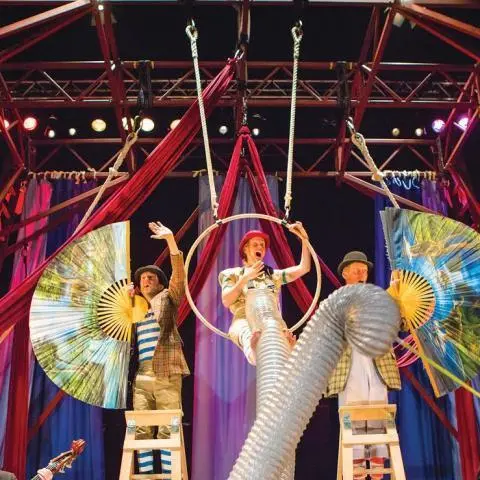 That focus was certainly necessary. The scenery and stage design are absolutely fantastic, but an assemblage of ladders, scaffolds, aerial silks and hoops became a veritable jungle gym for the actors, who handled the physical demands of climbing and swinging and contorting their bodies all to make real the carefree whimsy of the heroine’s imaginative “picturing games”. The actors crawled all over that rig; so much so, that if you took your eyes off one corner of the stage, you’d miss something, only to be greeted by another actor, dropping out of the ceiling in an entirely different role.