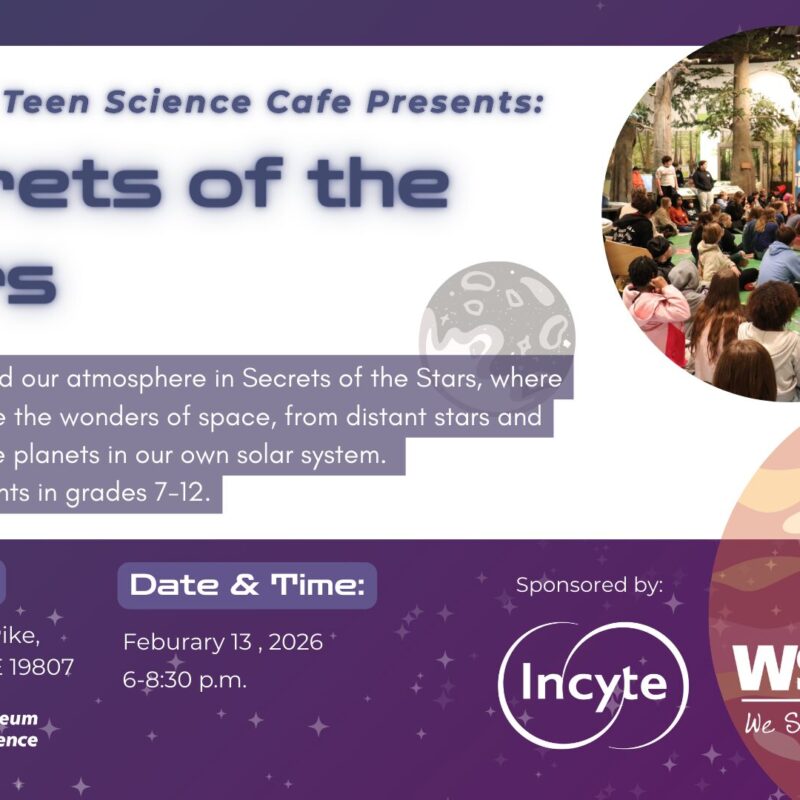 Animals & Science Delaware Teen Science Cafรฉ: Secrets of the Stars Journey beyond our atmosphere at the next Delaware Teen Science Cafe,ย Secrets of the Stars. Weโll… Delaware Museum of Nature & Science Information & Tickets