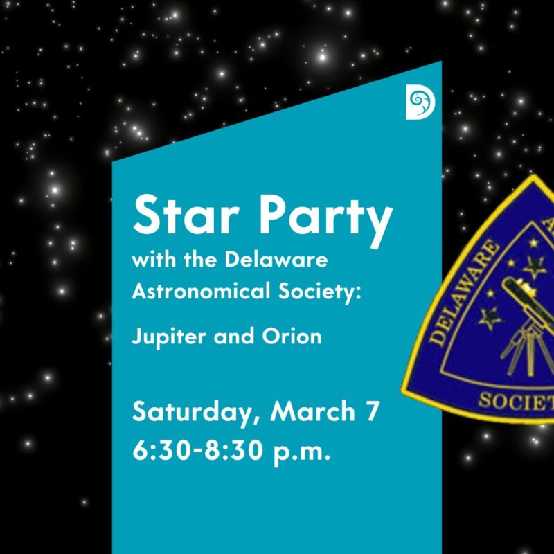 Animals & Science Saturday, March 7 Star Party with Delaware Astronomical Society: Jupiter and Orion Explore the galleries, try hands-on activities, and learn more about our night sky. The Delaware… Get Tickets