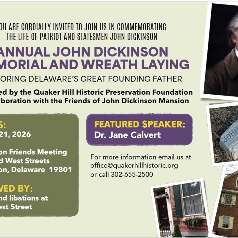 Arts & Entertainment Annual John Dickinson Memorial and Wreath Laying Join in commemorating the life of patriot and statesmen John Dickinson, Delaware’s great Founding Father.… Wilmington Friends Meeting House Information & Tickets