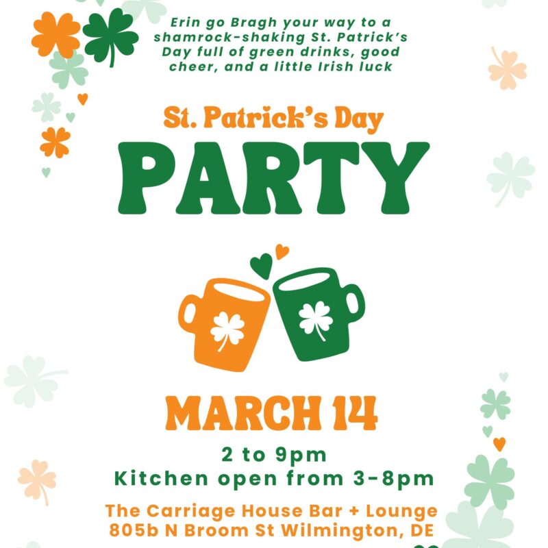 Community St Patrick’s Day at The Carriage House Celebrate St Patrick’s Day at The Carriage House Bar + Lounge. Door open 2-9pm, serving… The Carriage House Bar + Lounge Information & Tickets