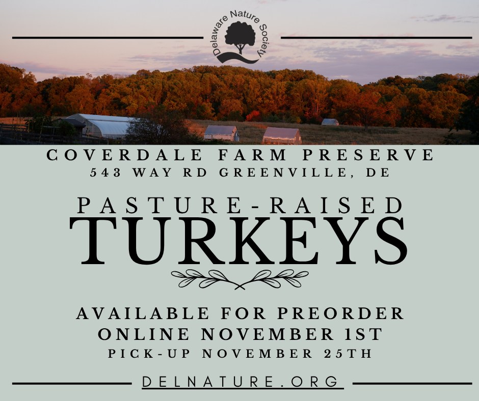 At pick-up, Thanksgiving turkeys will be weighed, and you will be charged the balance. $8/lb. At that time you may pay by cash, credit card, or check (payable to Delaware Nature Society).