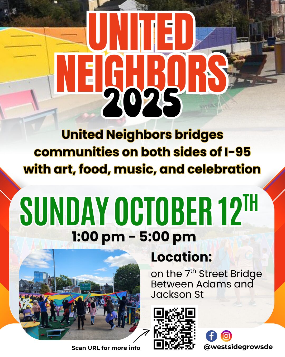 United Neighbors is a collaboration between community members and local organizations, who work to organize a collective celebration of the communities on both sides of I-95 through Wilmington. By closing down the bridges across I-95 (6th, 7th, 8th, 9th, 10th Street, and Delaware Avenue Bridges), the West Side and West Center City Communities literally bridge the gap I-95 created through art, improvements, food, conversation, and celebration.